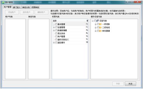 在二級菜單上點(diǎn)擊【用戶管理】按鈕,彈出用戶管理界面。可編輯部門、角色、用戶、角色權(quán)限和用戶權(quán)限。采用樹形結(jié)構(gòu)的管理方式,部門可任意建立(無限級),部門可以設(shè)置權(quán)限,人員隨便添加到各部門中,人員可以繼承部門的權(quán)限,權(quán)限可以自定義,滿足各種復(fù)雜情況下的權(quán)限管理,在固有權(quán)限中有人員控制設(shè)備的擴(kuò)展功能,不同的人員可以配置控制不同的設(shè)備。
