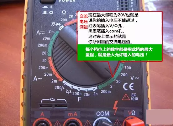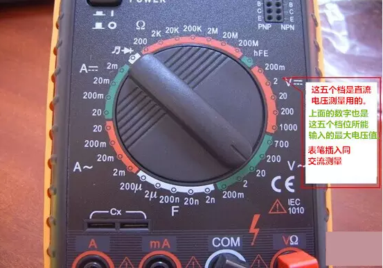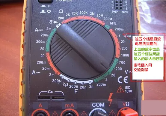 2、功能旋轉(zhuǎn)開關(guān)打至V~(交流),V-(直流),并選擇合適的量程 。